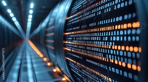 Binary code background in 3D rendering with computer technology concept. Futuristic data tunnel showcasing binary code in vibrant lights.