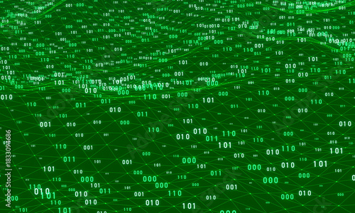 Binary code, big data, digital connection, plexus. Green polygons, wire frame, network, science, vector, futuristic, system, digital, abstract. 3D illustration
