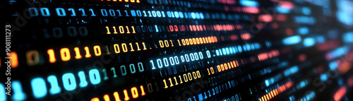 Binary Code Data Stream in Abstract Background featuring rows of binary numbers in blue and orange hues, representing digital technology and data processing.