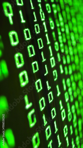 Binary code displayed on screen with green digits and dark background