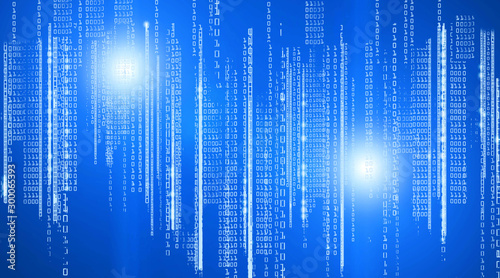 Binary code drawing on glowing blue surface. Cyber technology background.