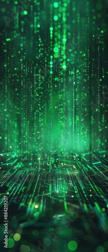 Binary code in green on a dark abstract background, technological aura, neon glow, front-facing, digital futurism