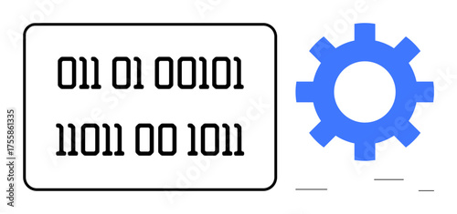 Binary code inside a rectangular frame paired with a blue gear cog. Ideal for programming, automation, technology, coding, machine learning, data processing, digital concepts. Simple flat metaphor