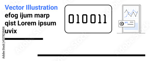 Binary code on digital screen paired with smartphone displaying upward trendline graph and analytics. Ideal for digital innovation, coding, data analysis, finance, statistics, technology, simple