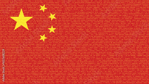 Binary code on flag of China. Program source code or Hacker concept on Chinese flag. China digital technology security, hacking or programming