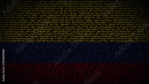 Binary code on flag of Colombia. Program source code or Hacker concept on Colombian flag. Colombia digital technology security, hacking or programming