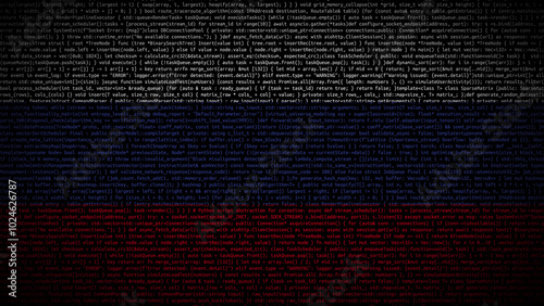 Binary code on flag of Russia. Program source code or Hacker concept on Russian flag. Russia digital technology security, hacking or programming