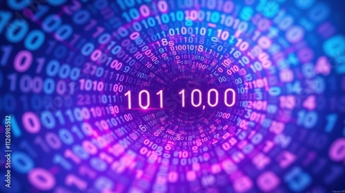 Binary Code Spiral Abstract Digital Data Visualization of a Rotating Sequence of Ones and Zeros, Featuring a Central Highlight of 101 10,000