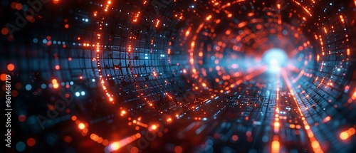 Binary code tunnel with glowing red particles, data network hacking