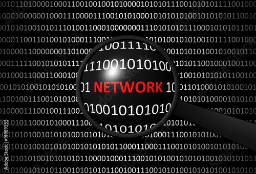 Binary code with NETWORK and magnifying lens