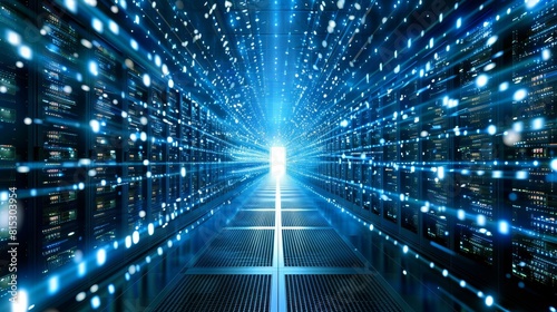 Binary tunnel. Blue glowing binary code. Data flow. Matrix background.