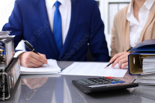 Binders with papers are waiting to be processed with businessman and secretary back in blur. Internal Revenue Service inspector checking financial document.
