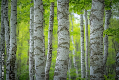 Birch tree forest in spring, sunlight filtering through leaves, showcasing white bark and green foliage.
