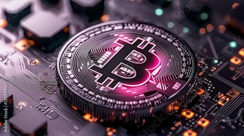 Bitcoin Digital Currency Coin on Electronic Circuitboard Close-Up with Glowing Effects