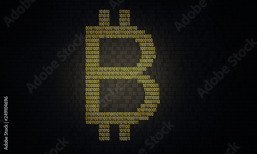 Bitcoin symbol. 3D Illustration of gold Bitcoin logo on the dark digital background with a stream of binary matrix code on the screen numbers of the computer matrix. The concept of coding.