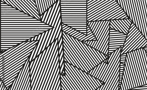 Black and white abstract geometric pattern with diagonal striped shapes and overlapping triangular forms. Modern design style on a seamless background.