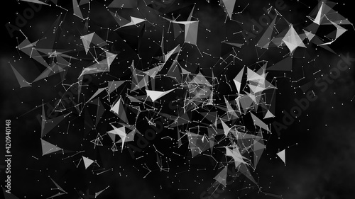 Black and White blurred abstract plexus particle effect background. Mess communication technology network background with moving lines and dots. Tech connection futuristic web concept texture.