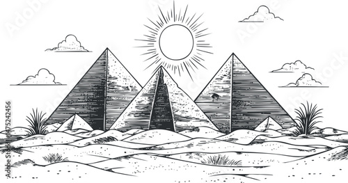 Black and white illustration of ancient pyramids in a desert landscape under the sun with clouds