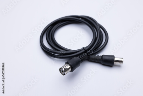 Black coax cable on white background