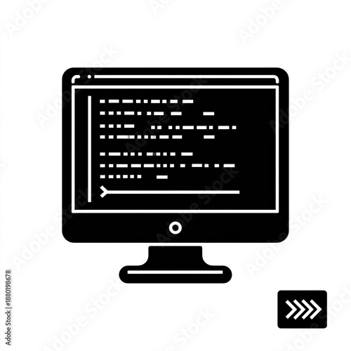 Black computer icon with coding display on screen and a right-pointing arrow