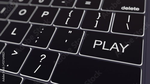 Black computer keyboard and glowing play key. Conceptual 3D rendering
