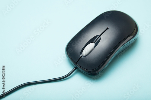 Black computer mouse with a cord on a blue background. Close-up.