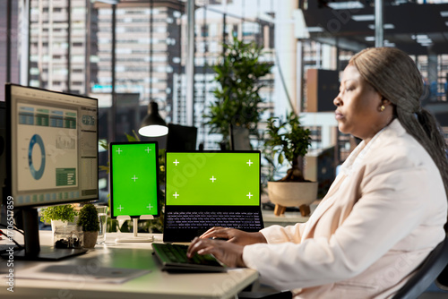 Black female worker reads a financial report brief next to chroma key sits at desk, working on global development strategy for the company. Employee examining important web data.
