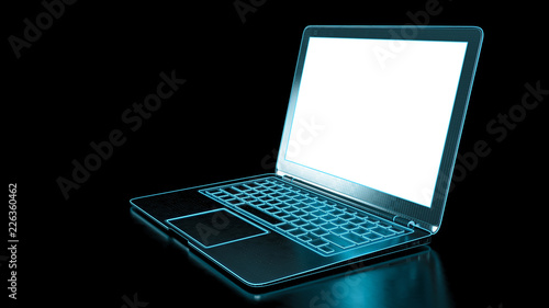 Black laptop with blue neon light on dark background. Notebook with empty blank screen. Computer technology and internet web communication concept. 3d Illustration