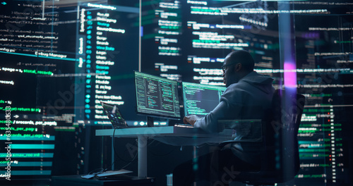 Black Male Developer Thinking and Typing on Computer, Surrounded by Big Screens Showing Coding Language. Professional Programmer Creating Software, Running Coding Tests. Abstract Programming Concept