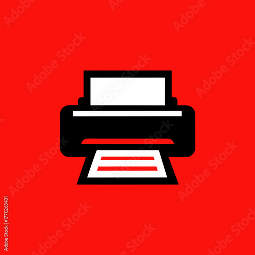 Black printer with white paper against red backdrop