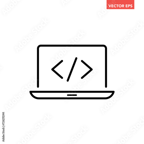 Black single coding laptop line icon, simple tech programming computer flat design pictogram vector for app ads web banner button ui ux interface elements isolated on white background