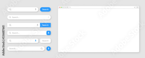 Blank internet browser window with various search bar templates. Web site engine with search box, address bar and text field. UI design, website interface elements. Vector illustration