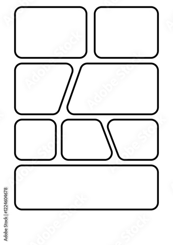 Blank manga storyboard template with various panel shapes and sizes, perfect for creating comic layouts. Ideal for artists and illustrators to plan and design their manga or comic stories