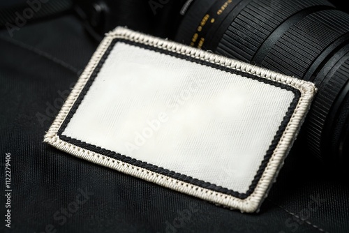 Blank rectangular fabric patch mockup with stitched border on black background, perfect for branding design.