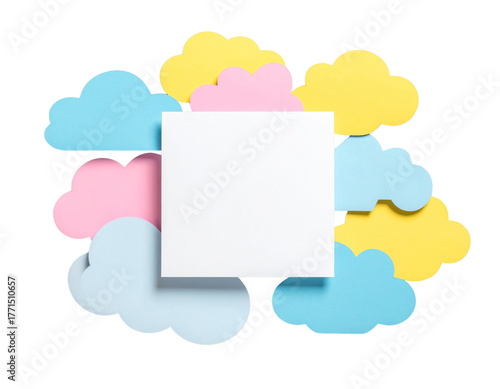 Blank square card surrounded by colorful clouds on black background