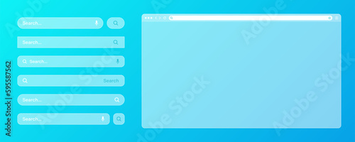 Blank transparent internet browser window with various search bar templates. Web site engine with search box, address bar and text field. UI design, website interface elements. Vector illustration