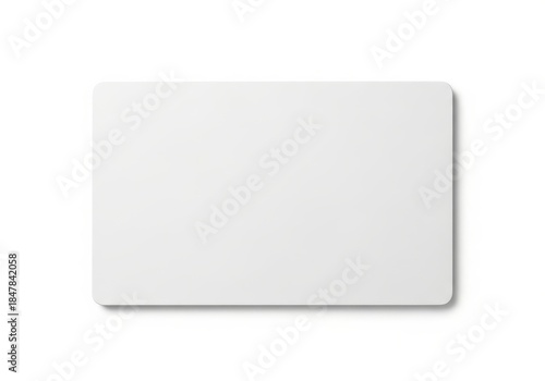 Blank white rectangular plastic card with rounded corners casts a subtle shadow on a white surface