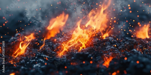 Blazing Inferno: A close-up shot captures the raw power and beauty of a raging inferno, showcasing fiery flames dancing against a backdrop of smoke and embers, symbolizing destruction and renewal.