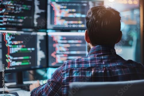 Blockchain developer coding on multiple screens, selective focus, decentralized network, dynamic, multilayer, tech office backdrop
