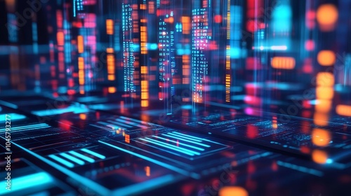 Blockchain disruption, augmented finance interface, floating data points, futuristic cityscape