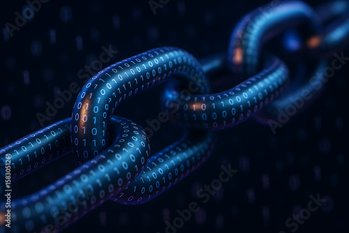 blockchain, encrypted chain, 3D render of metallic chain links coated with glowing binary code, symbolizing secure digital encryption, blockchain technology, and data integrity in a connected network