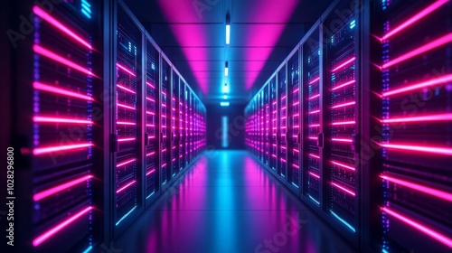 Blockchain server room, neon glow, high-tech efficiency, dark space