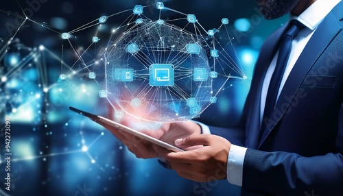 Blockchain technology, data encryption. Businessman using tablet with AI advanced database mechanism that allows transparent information sharing within a business network