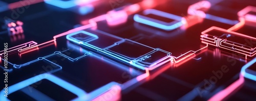 Blockchain technology, visualized in neon circuits, abstract financial data