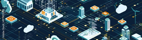Blockchain transaction volume, smart grid components, backup energy storage, flat design illustration