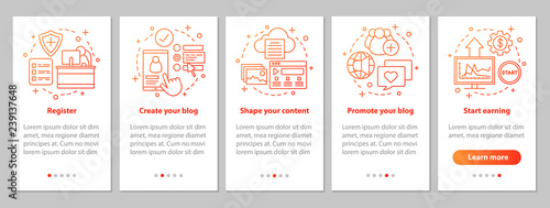Blogging onboarding mobile app page screen with linear concepts