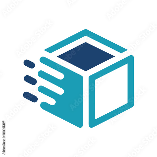 Blue and teal abstract cube with motion lines on white background geometric shape