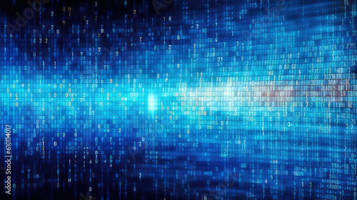 Blue and white binary hex matrix on a dark background with a light stripe symbolizes stock, data, control, system, transparency, generative AI