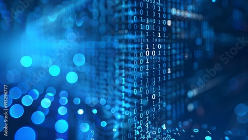 Blue binary code background with bokeh effect, computer digital data and technology concept.