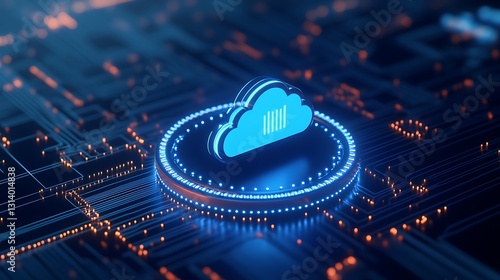 Blue Cloud Icon Surrounded by Bright Circuits and Light Effects Representing Cloud Computing Technology